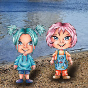 Ihr Haar ist kurz und pink, sie mag es farbenfroh. Sie möchte ihre Pinsel immer dabei haben, daher trägt sie eine Schürze mit Taschen. Da sind sie gut aufgehoben und sie kann jederzeit loslegen.